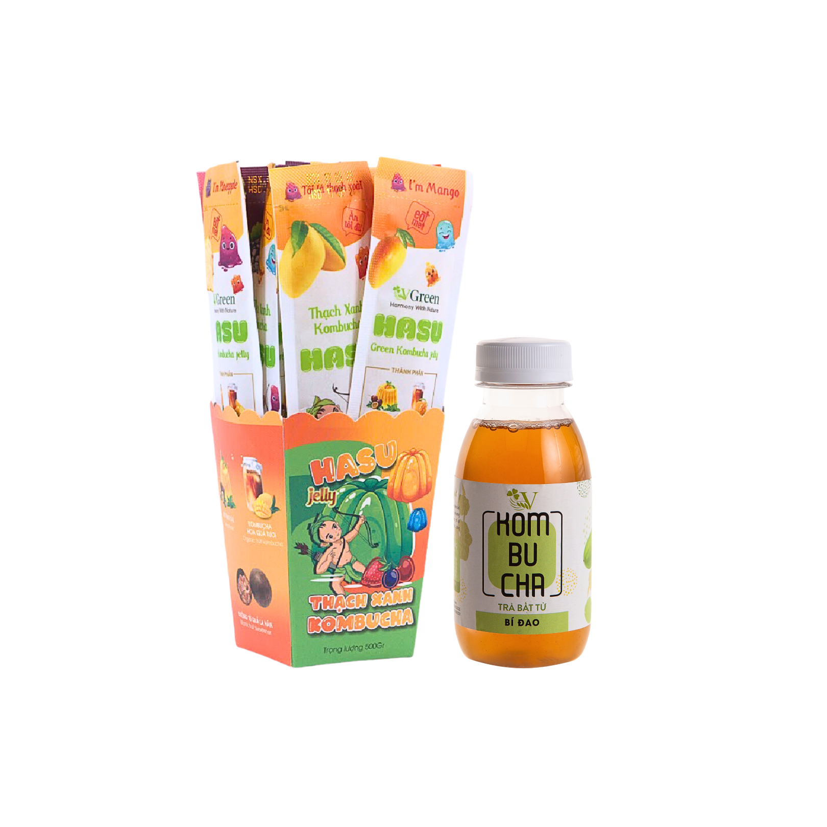 - Hương vị: Thạch xanh kombucha mix vị đào, chanh leo, dâu tằm, dứa, vải, xoài, quýt. Vkombucha Light vị bí đao