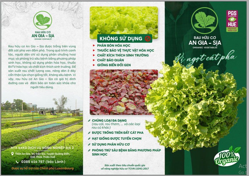 Rau hữu cơ An Gia sịa đựa trồng trên đất cát . Trong quá trình canh tác người dân sử dụng phân chuồng hoai mục và phòng trừ sâu bệnh bằng phương pháp sinh học, không sử dụng phân hóa học, thuốc bvtv hóa học và chất kích thích sinh trưởng. Để sản xuất rau chất lượng cao, nông dân ở đây cẩn thận giống tốt, kháng sâu bẹnh. Vì vậy rau hữu cơ an gia sịa có dinh dưỡng cao và đảm bảo sức khỏe cho người tiêu dùng